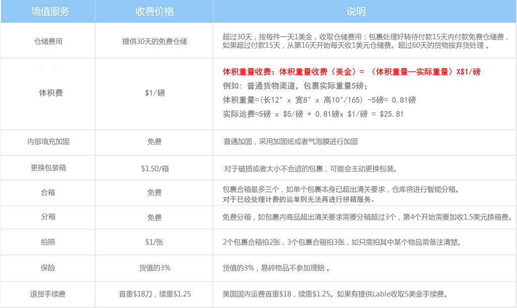 體積重量收費(fèi):體積重量收費(fèi)(美金)= (體積重量—實(shí)際重量)X $1/磅