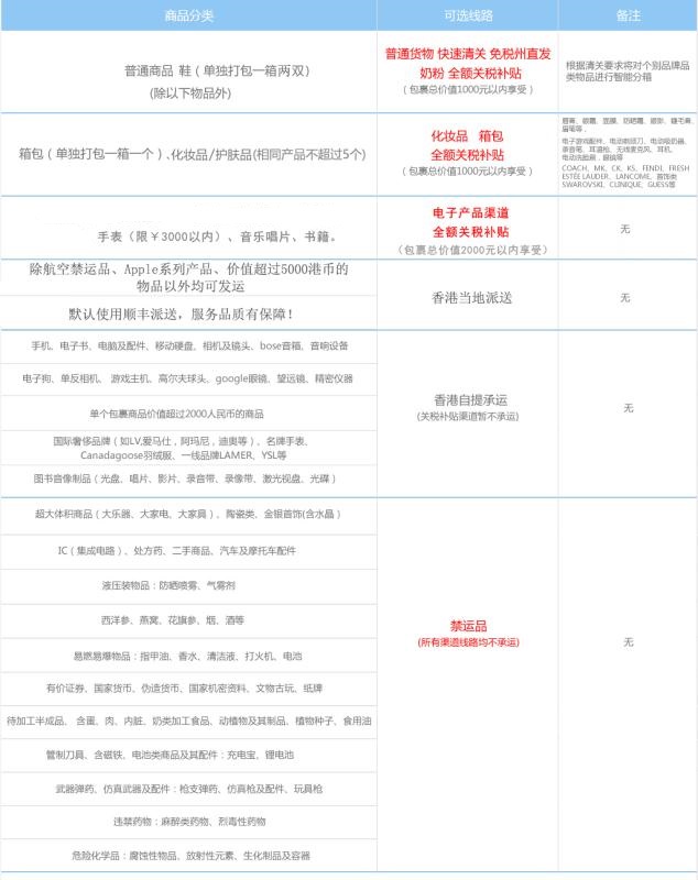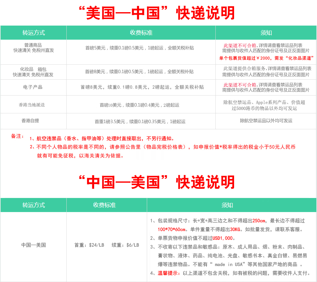 注:“美國(guó)--香港件”免收實(shí)際重量2倍以內(nèi)體積重量。